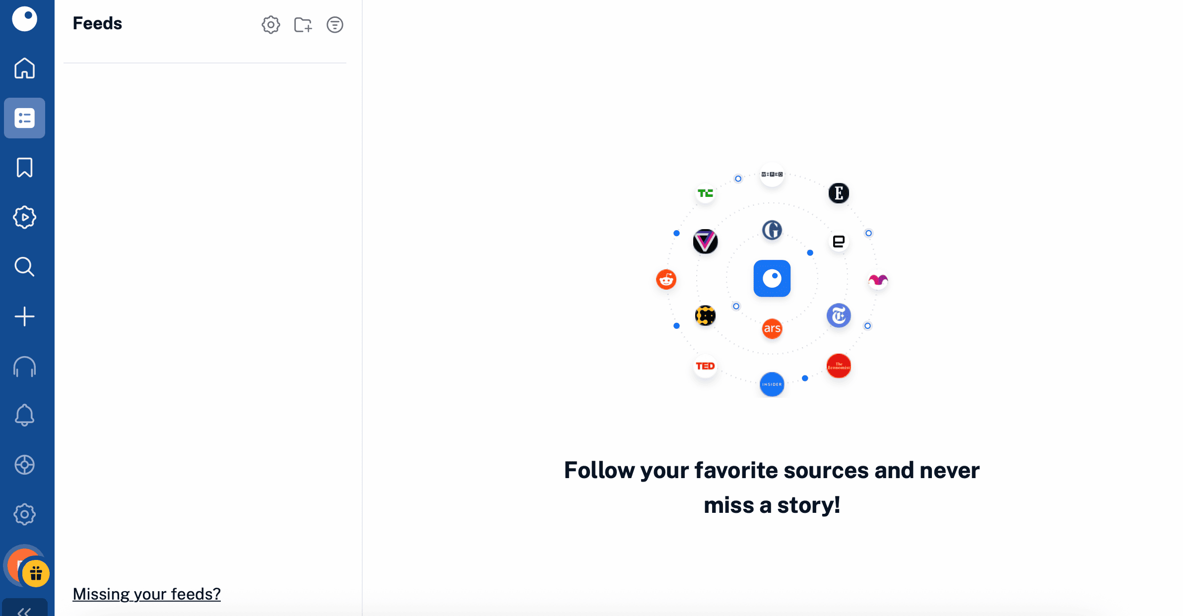 - 首先打開你的inoreader,進到Feeds的地方,可以看到空無一物,這很正常,因為RSS就是由你自己決定要看到什麼,而不是交由演算法推薦給你