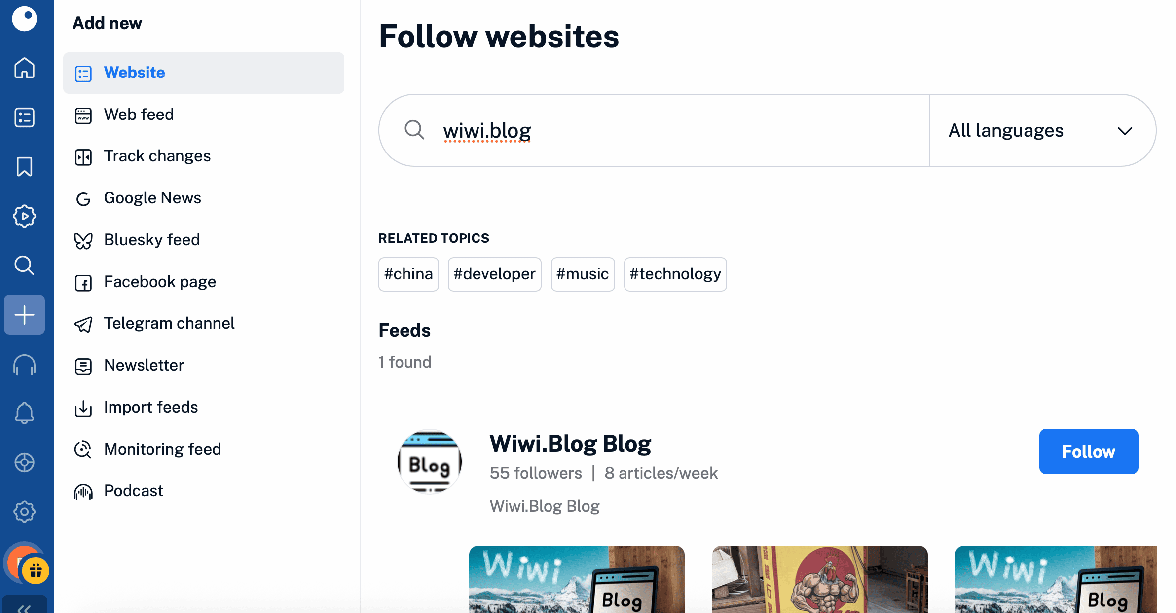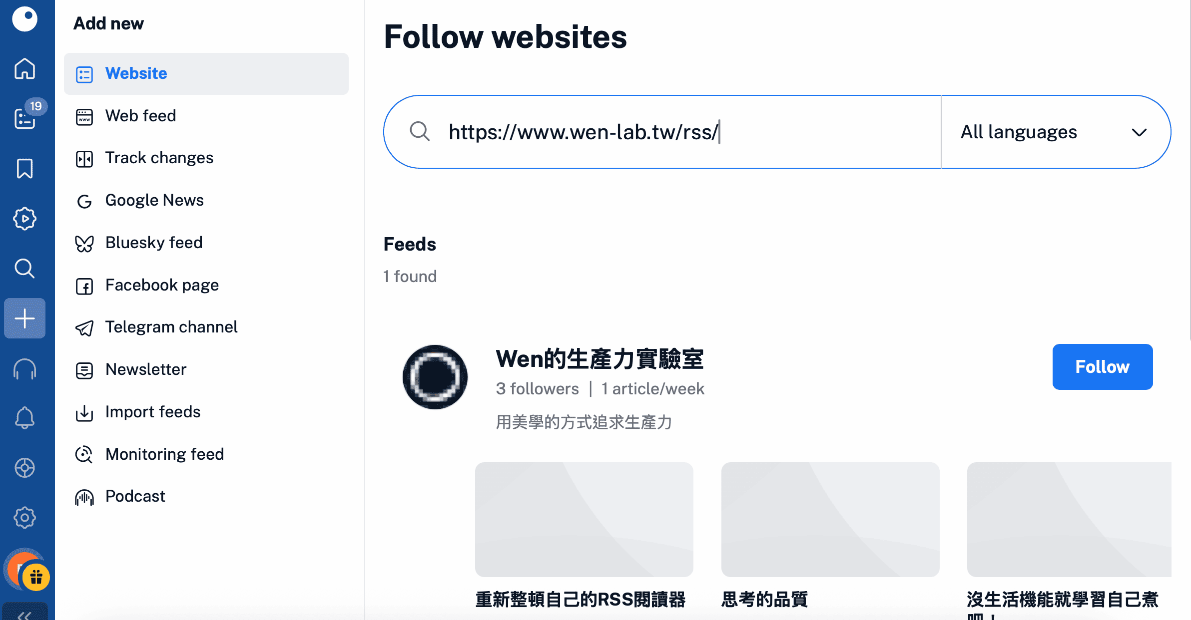 - 一些熱門的網站,直接輸入關鍵字就可以找到feed,例如輸入「wiwi.blog」(好和弦創辦人官大為的個人部落格),右下角有一個藍色的Follow按鈕,代表已經抓到feed了,按下去就可以訂閱。