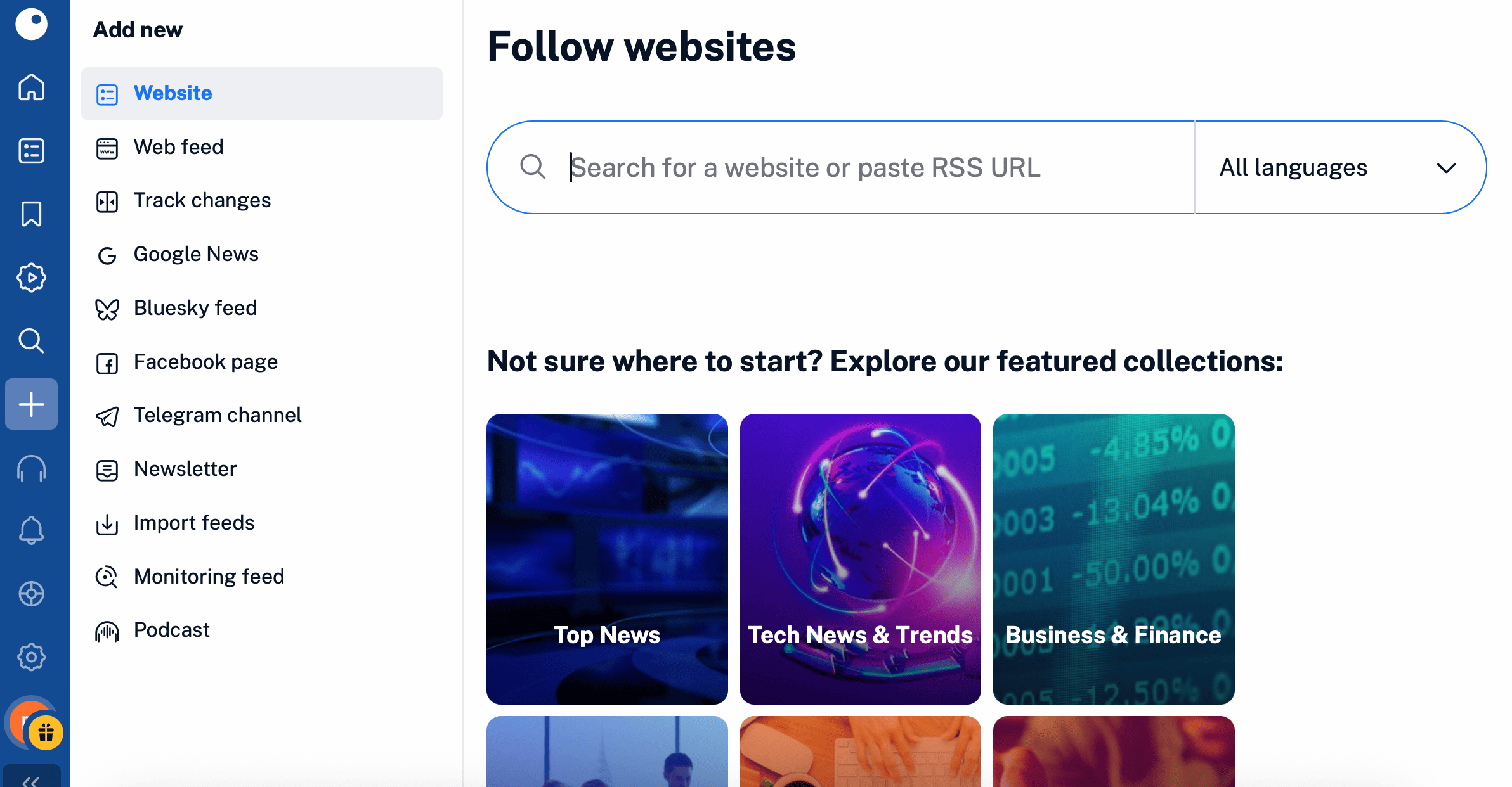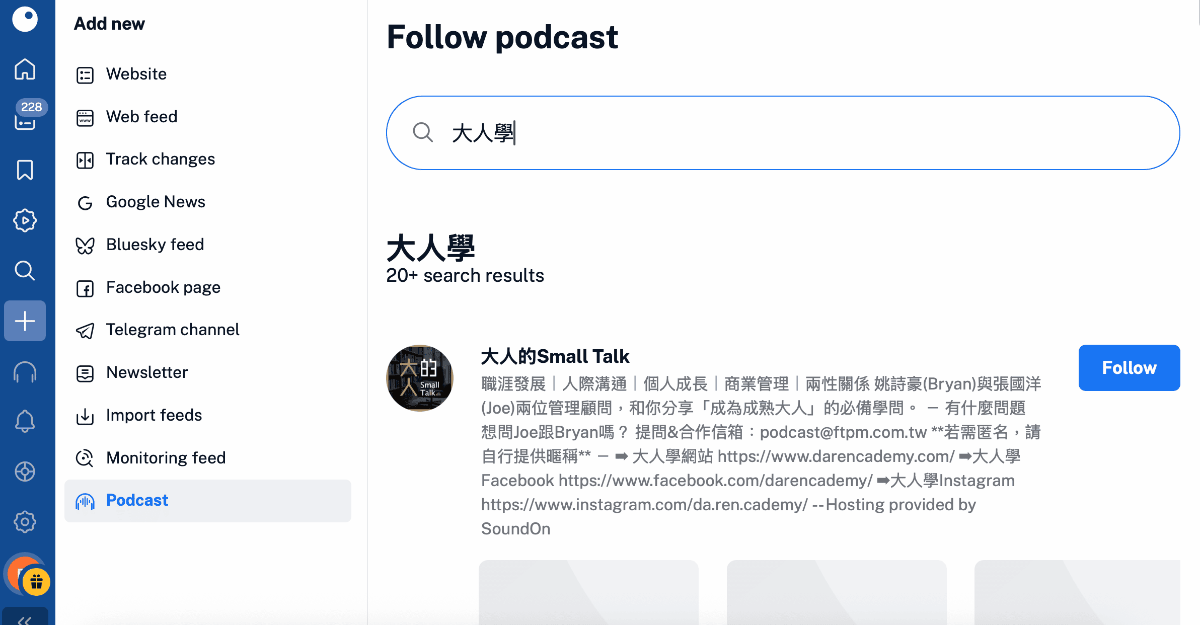 - 進到添加Feed的頁面,可以看到左側欄有很多種添加方式,右側欄有點像是搜尋欄位,你可以直接搜尋網站的關鍵字,或是加入RSS feed的網址來搜尋