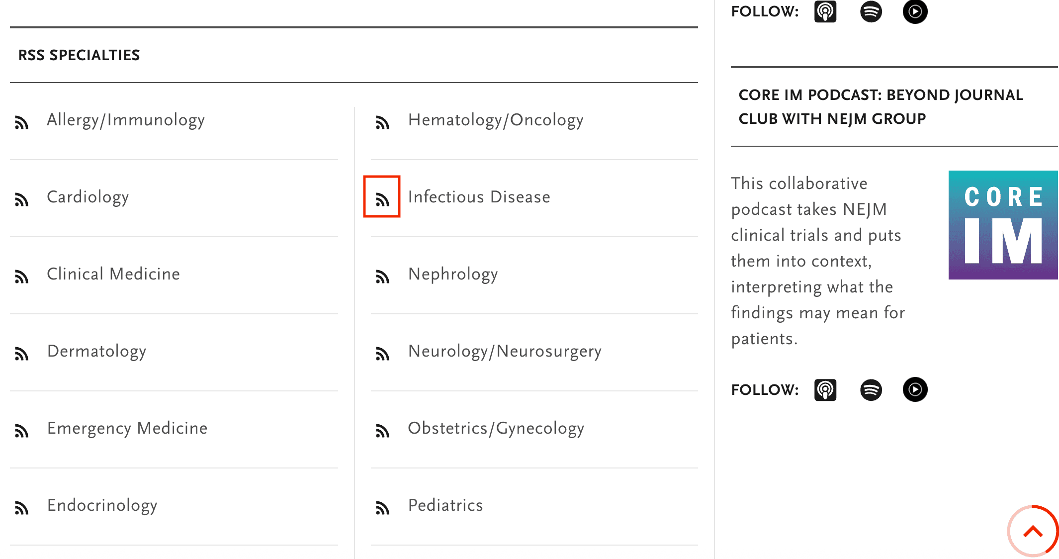 有些部落格和網站,你可以去找RSS feed或是一個像是向右傾斜的wifi圖示,就可以找到RSS訂閱網誌,例如醫學期刊NEJM,拉到網站最底部,就可以找到「RSS Feed」