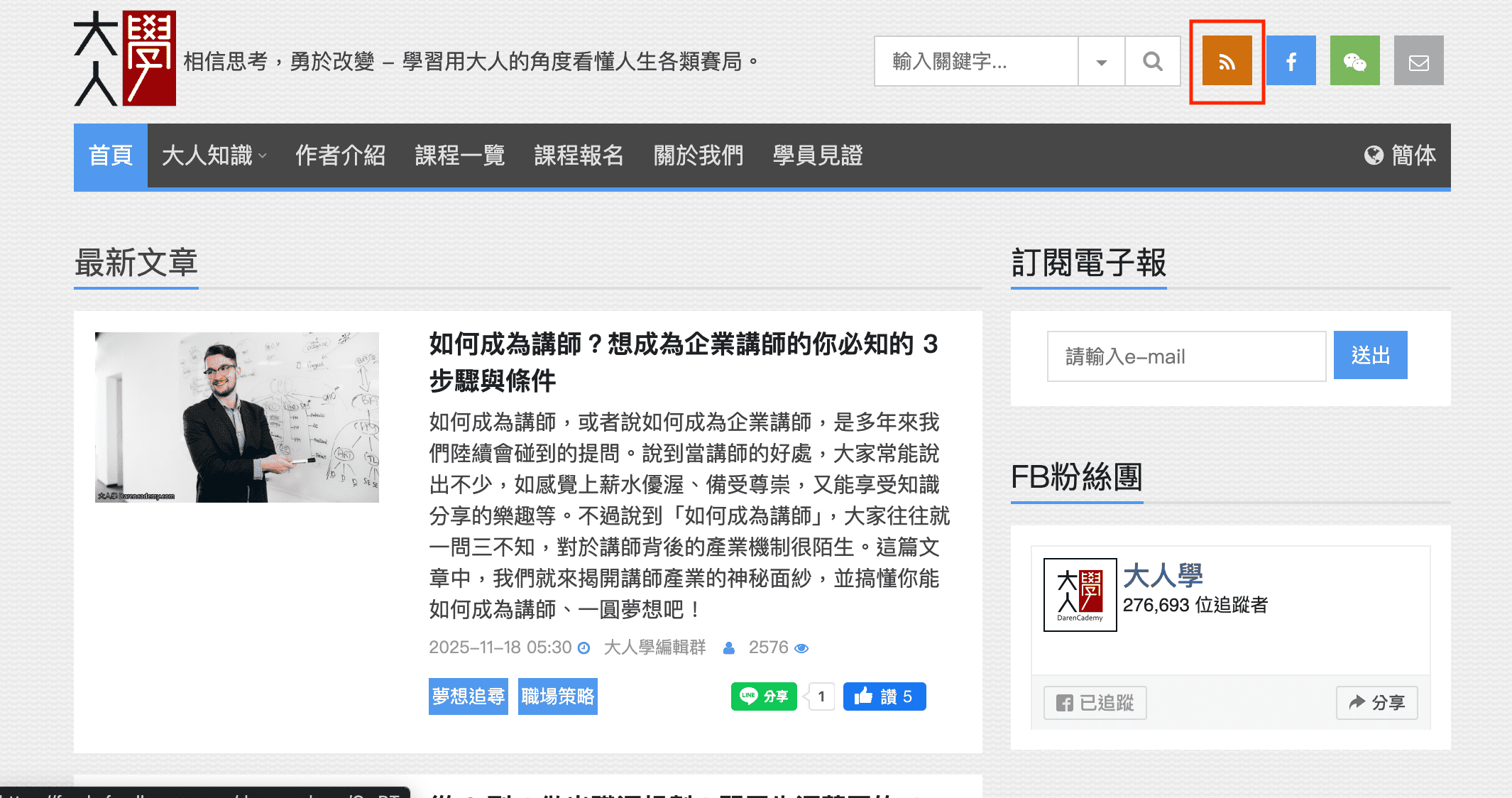 我自己很常去上實體課的大人學網站,首頁右上角也是有提供RSS訂閱
