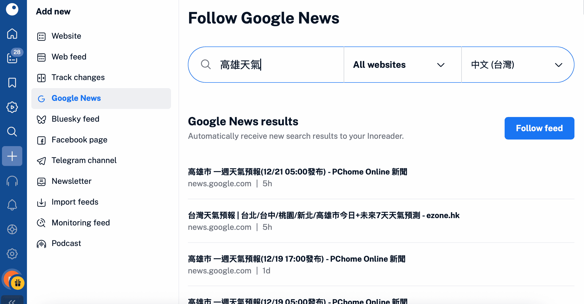 最後來介紹新聞的訂閱,用inoreader裡面的Google News就可以很方便的訂閱