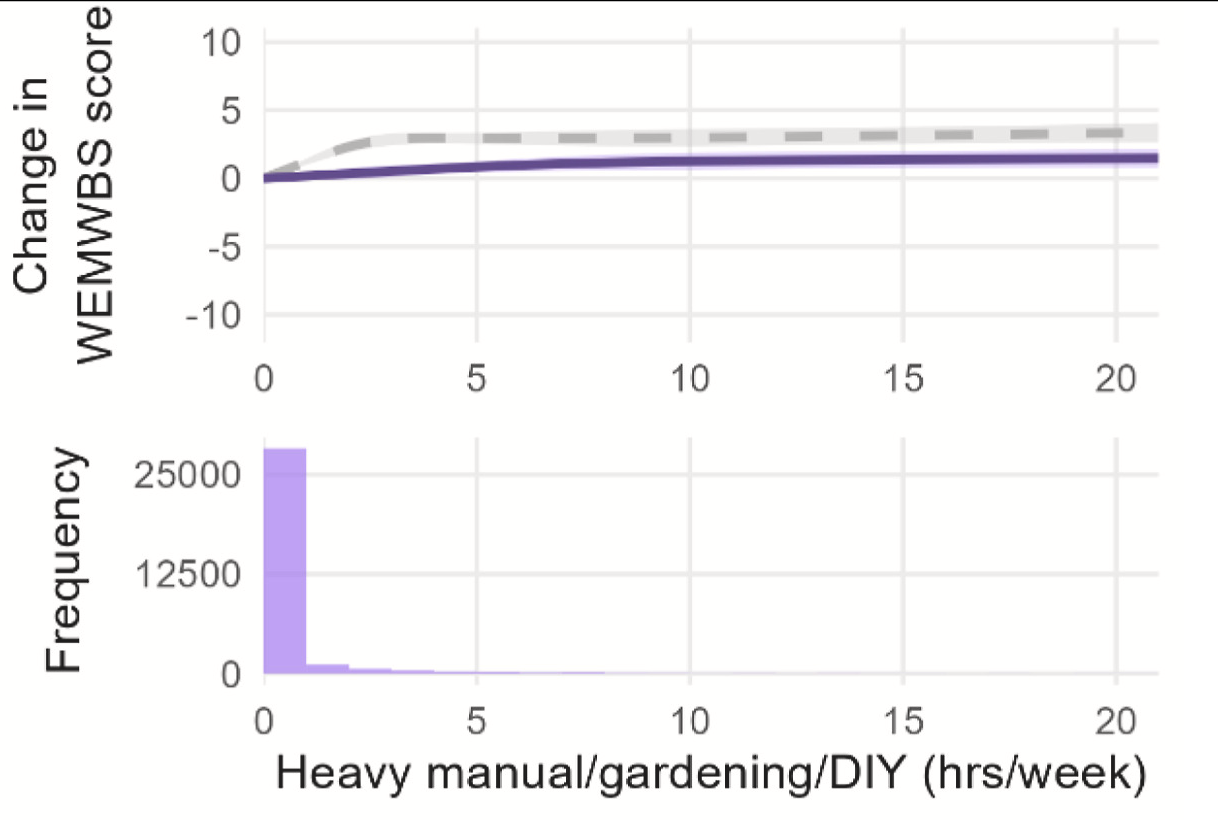 因為好奇,我去找了一下有沒有相關的學術論文在研究這個事情,結果還真的有,一篇蘇格蘭的研究發現,重度手工藝(包含園藝與 DIY)、步行、運動與鍛鍊和心理健康有正相關,而高程度的電視/螢幕久坐時間則與心理健康呈負向關聯。